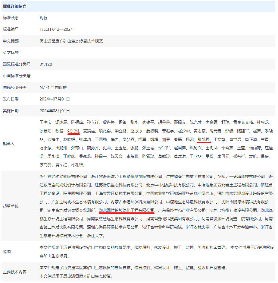 2024年7月1日,由中國長城綠化促進會發(fā)布的《歷史遺留廢棄礦山生態(tài)修復技術規(guī)范》團體標準通過審定,將于2024年8月1日開始實施。湖北回然護坡綠化工程有限公司劉興銀、張凱強參與起草。