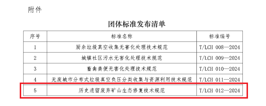 T/LCH 012—2024《歷史遺留廢棄礦山生態(tài)修復技術規(guī)范》團體標準適應新形勢、新要求,對歷史遺留廢棄礦山生態(tài)修復問題調(diào)查與識別、方案編制、工程實施、后期管護等內(nèi)容作出了規(guī)定,同時技術措施科學合理,附錄資料齊全,可操作性強,是指導歷史遺留廢棄礦山生態(tài)修復的重要技術文件。